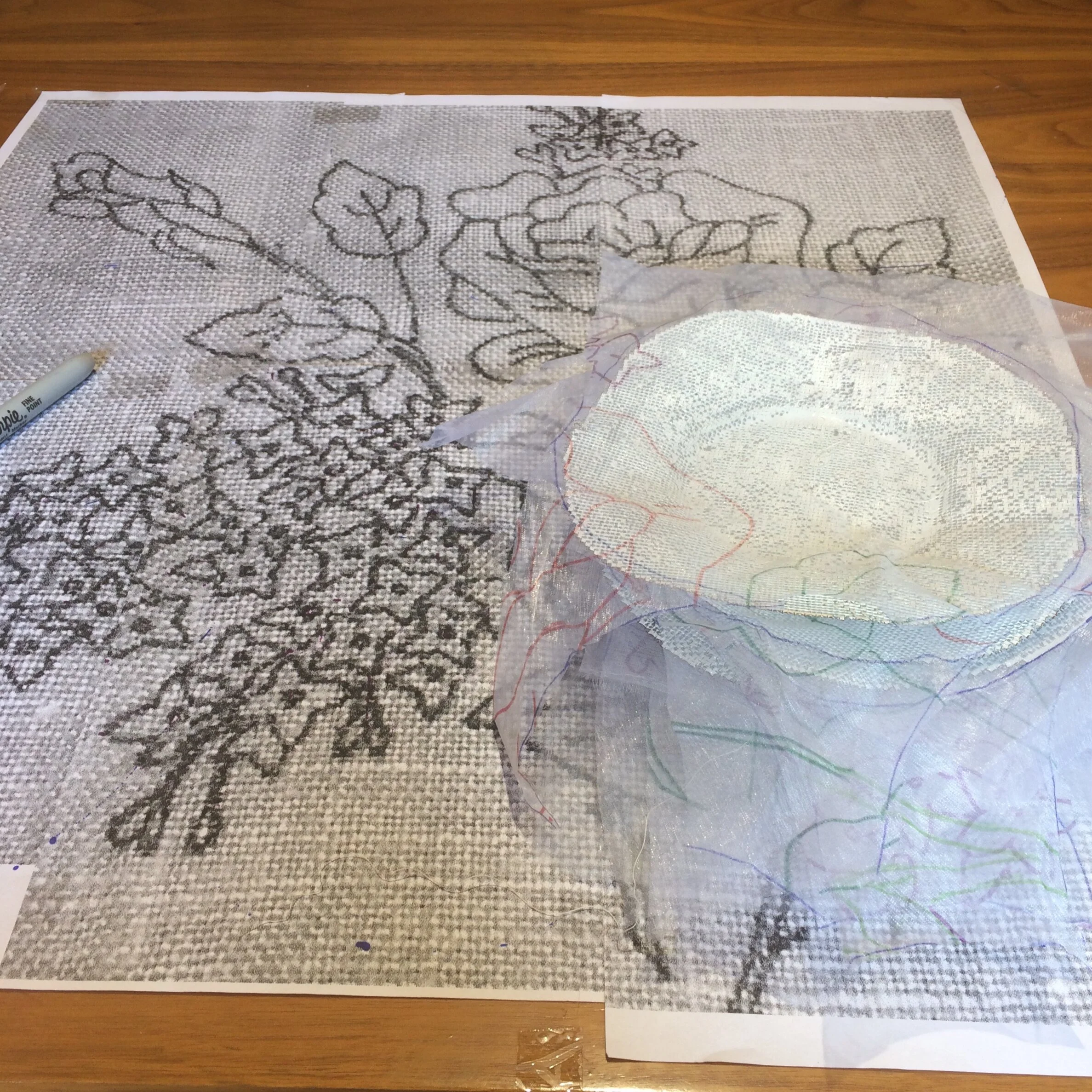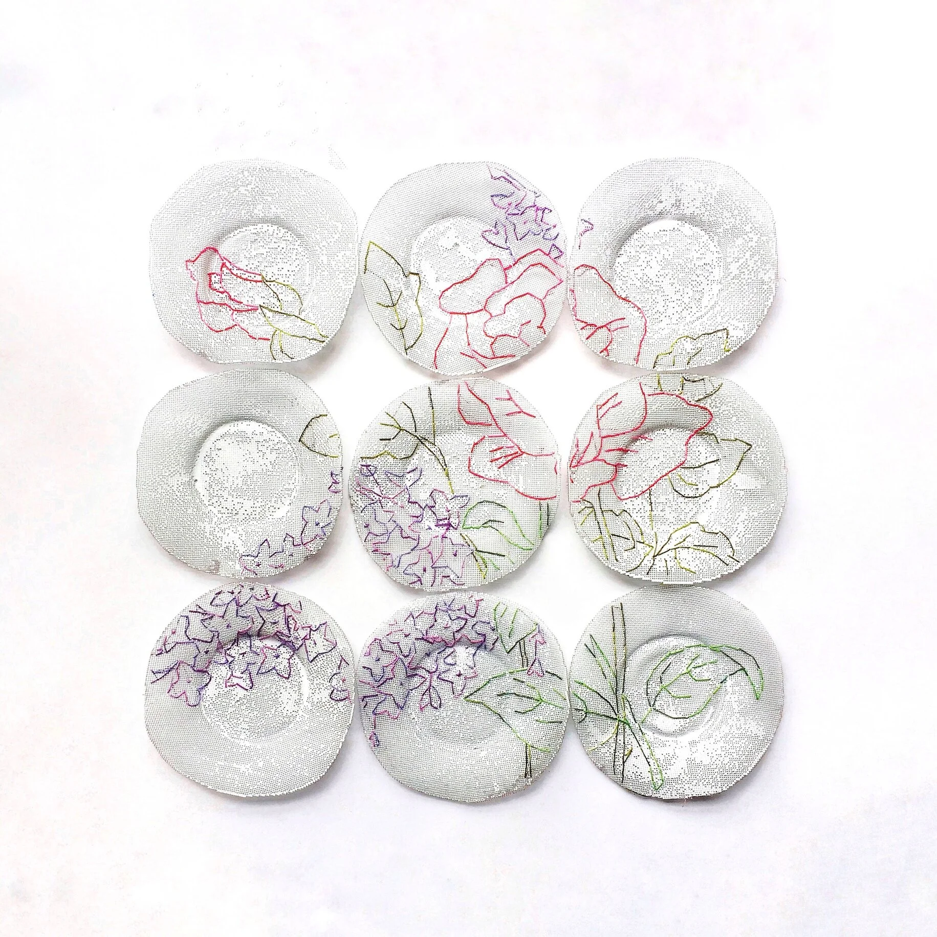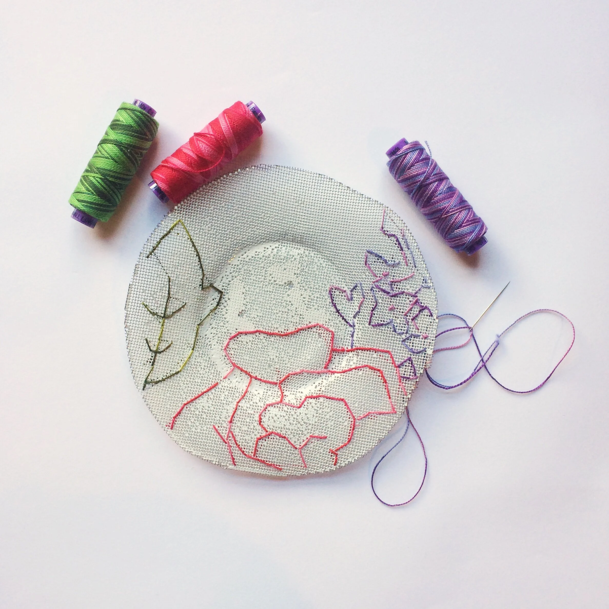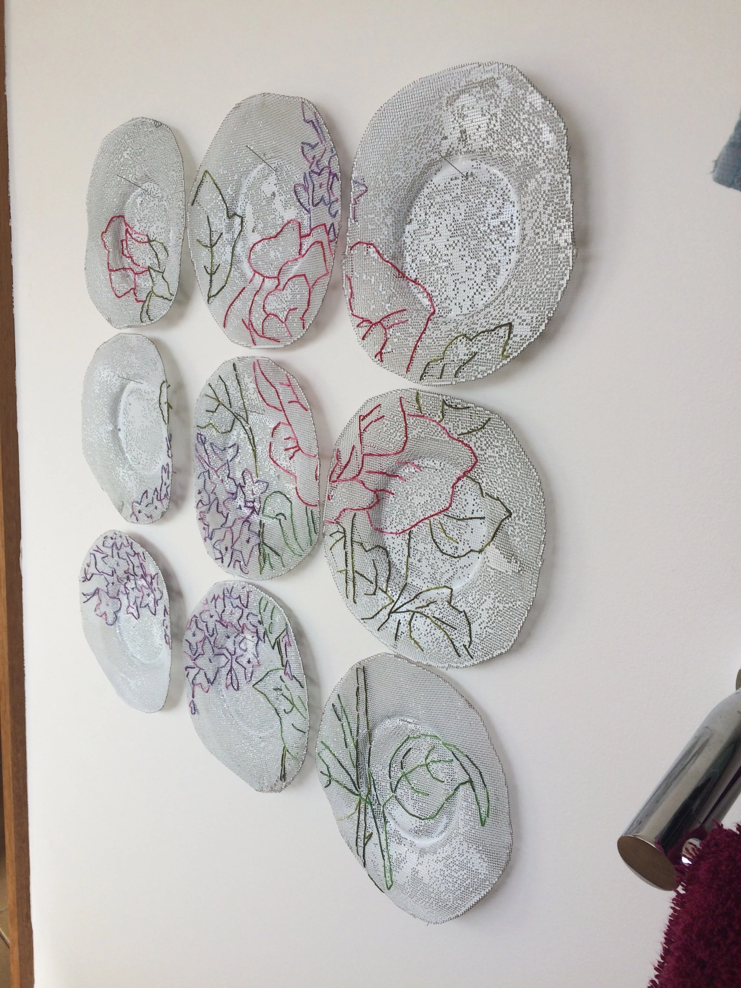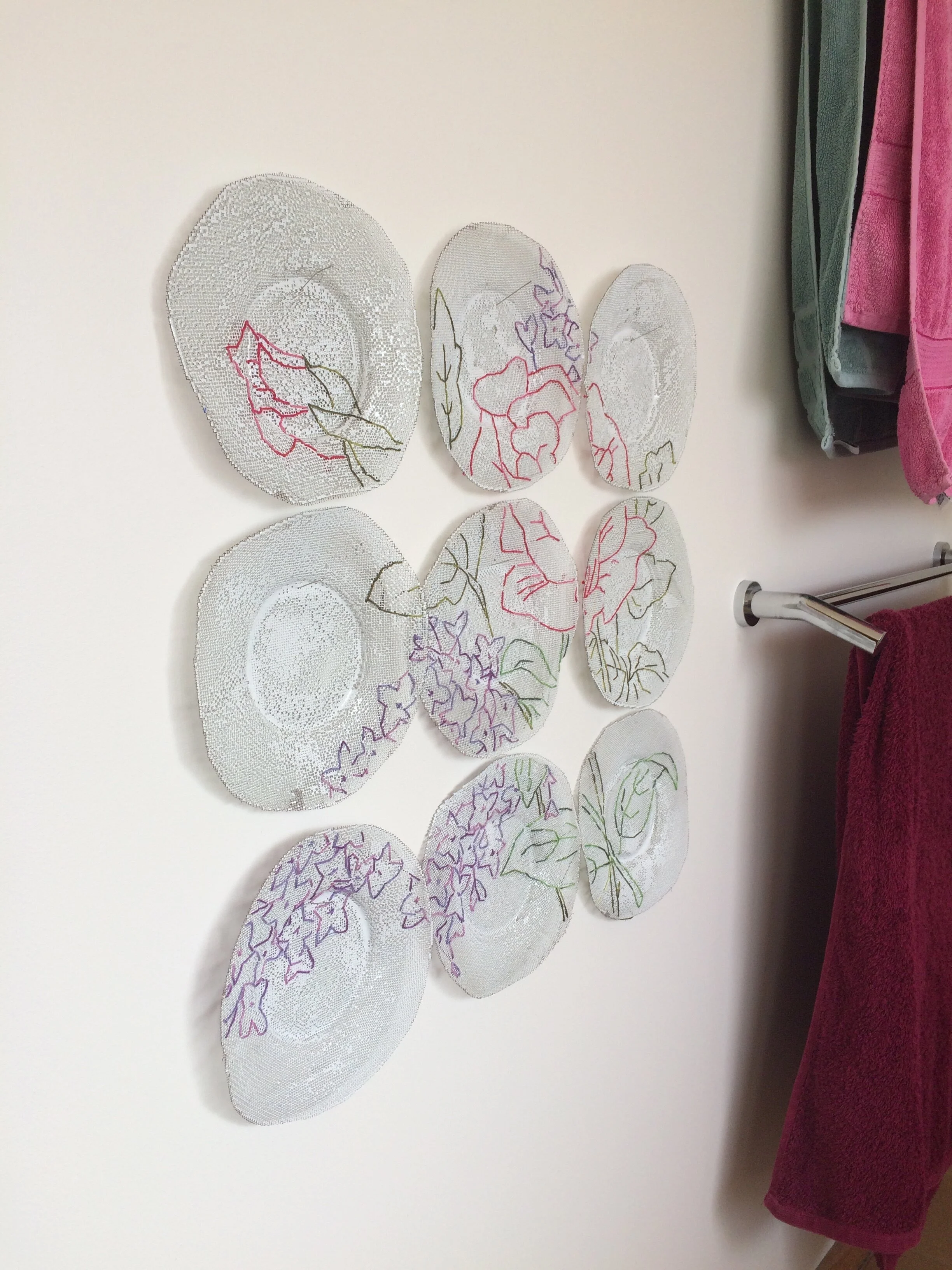 This set of 9 enamelled copper mesh ‘plates’ are placed alongside one another on a wall, with a design found embroidered onto a vintage traycloth - a floral tribute flowing from one plate to the next speaking of connection and fellowship, that we are not complete until we join with those around us. Referencing generations of households that adorn their home life by placing crockery on the wall to admire and beautify, these plates ground the viewer within the domesticity sphere, celebrating the familial and elevating the humble plate to a precious object.