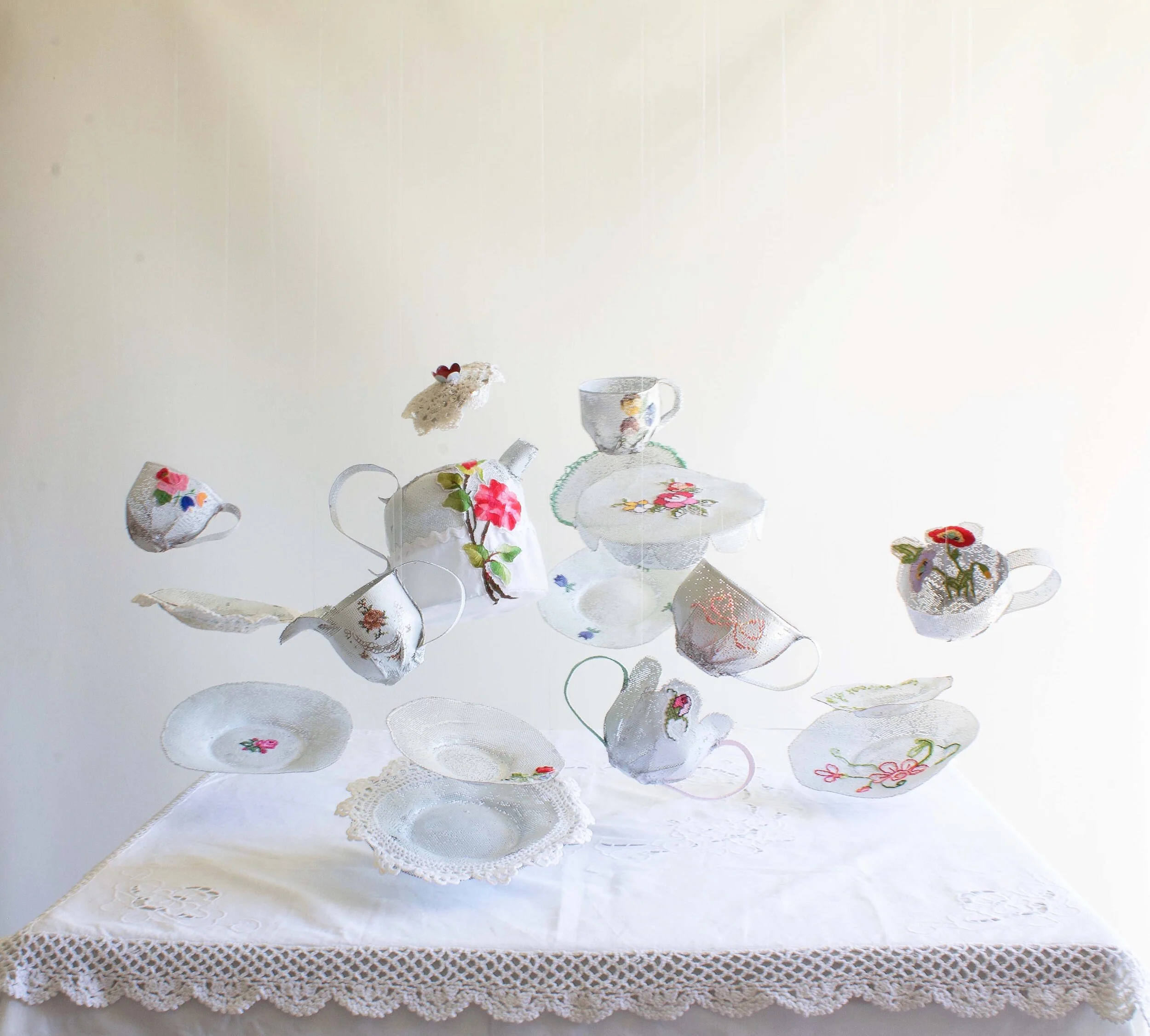This installation in the form of a tea set is made from copper mesh, every element is dipped into vitreous enamel and fired until the glass melts and adheres to the metal. Each piece of the work is decorated with a variety of surface treatments – appliqued elements from found embroidered and crocheted doilies, applied photographic decals, or stitched and embellished with a variety of threads and yarns. This tea set isn’t practical; it would hold neither liquids nor food stuffs. The edges of each piece are sharp, catching skin and clothing as they contact; the enamel thin, clinging to the metal, allowing the gaps between the woven mesh to remain as holes, giving a transparency and ethereal quality to the normally solid, functional ware.