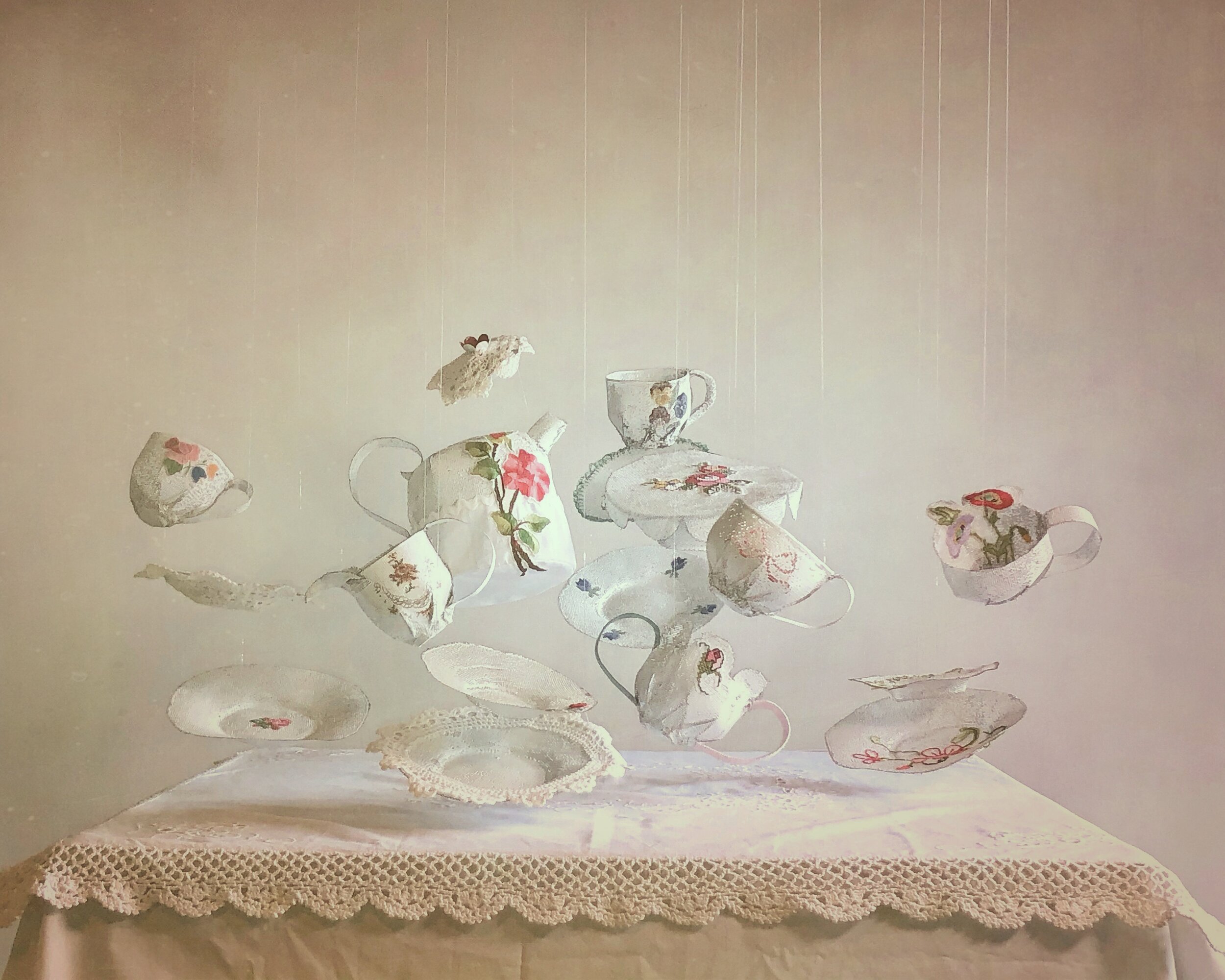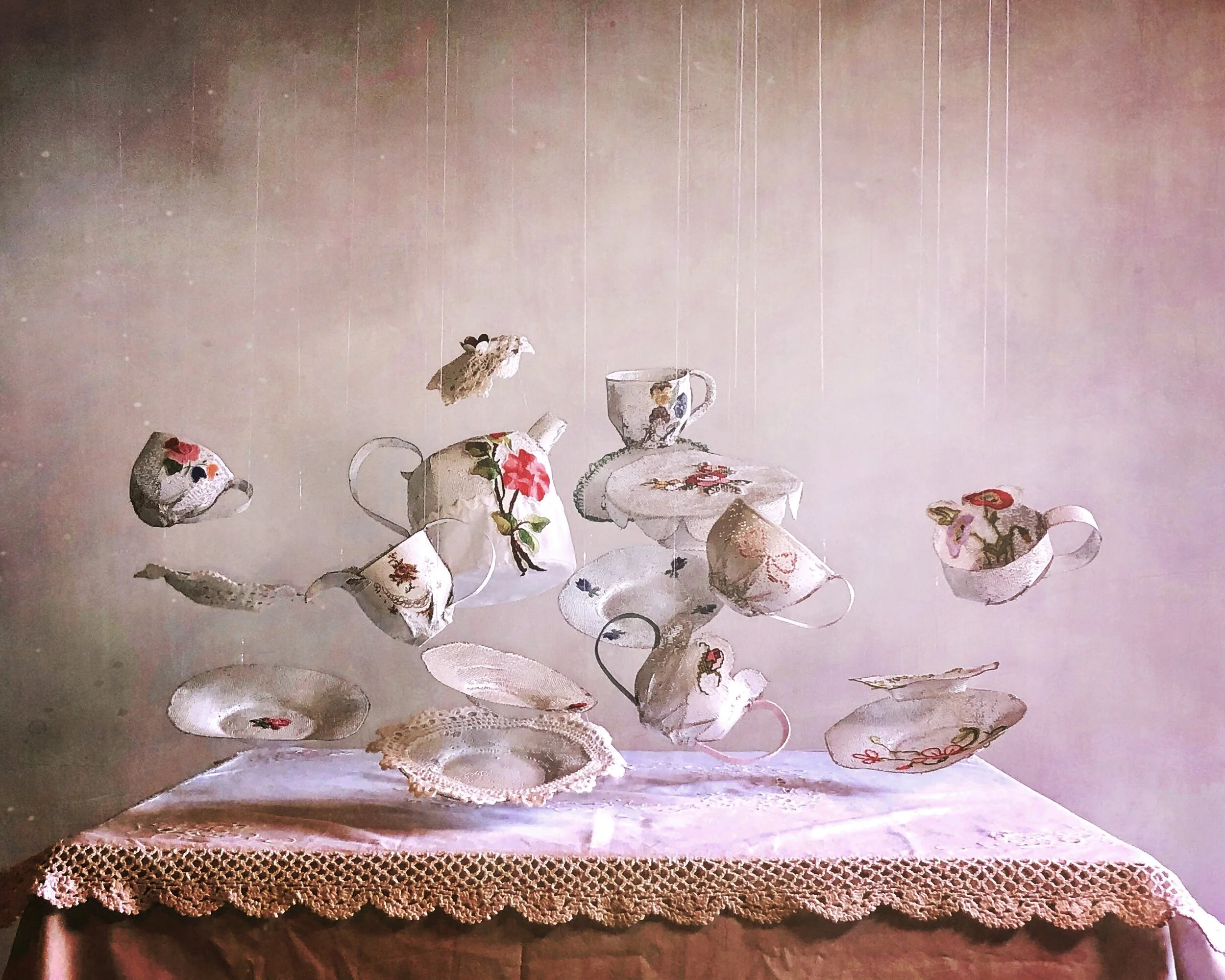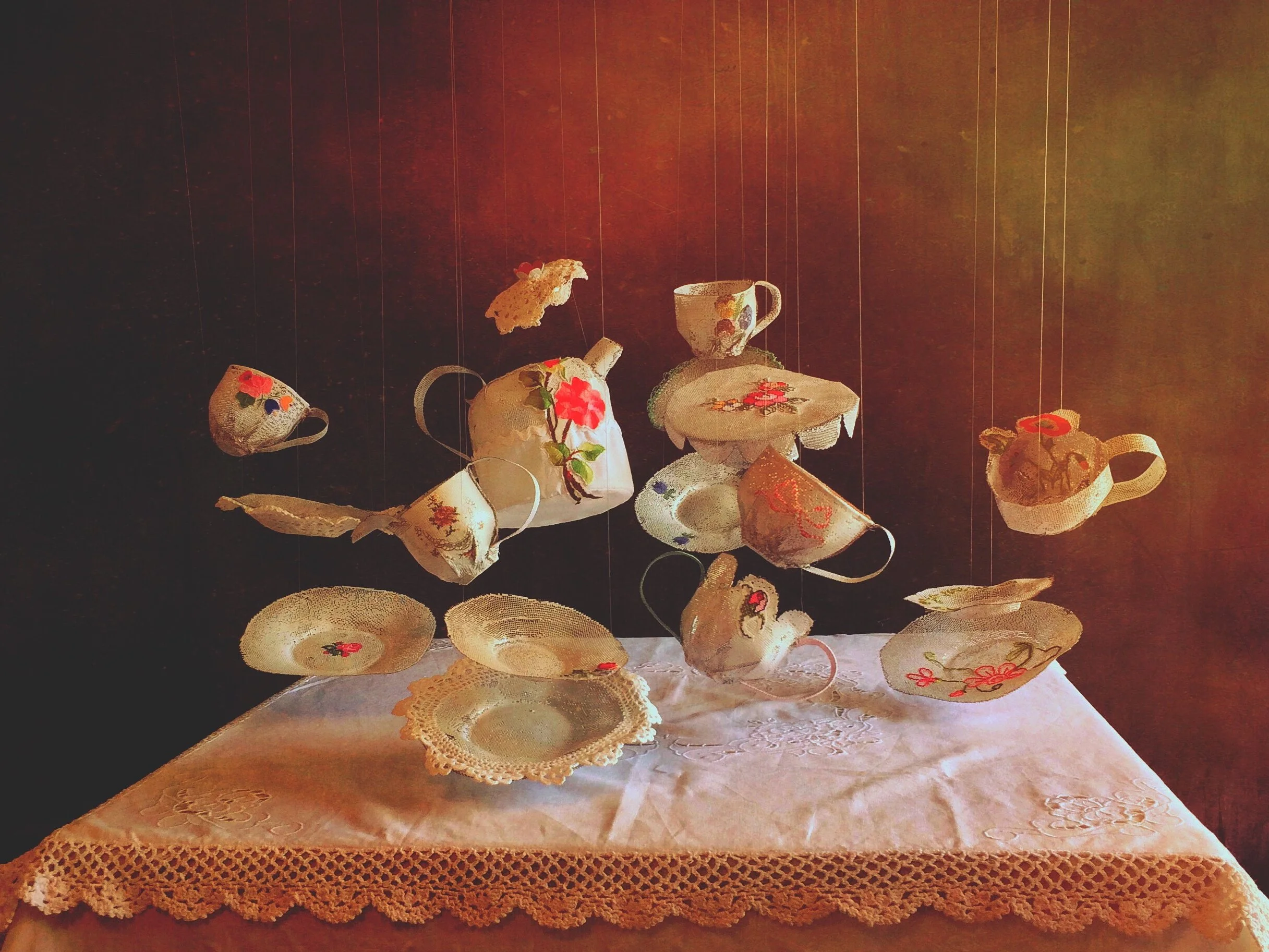 A tea set, a symbol of domestic normality and routine, celebrating the customary coming together of community around the dining table, has been thrown into disorder, frozen in a state of suspension and numbness. Waiting, we hold our breath for the time when the crockery can be reanimated and fall back to the table. Wondering which pieces will remain intact and return unscathed to their previous position.